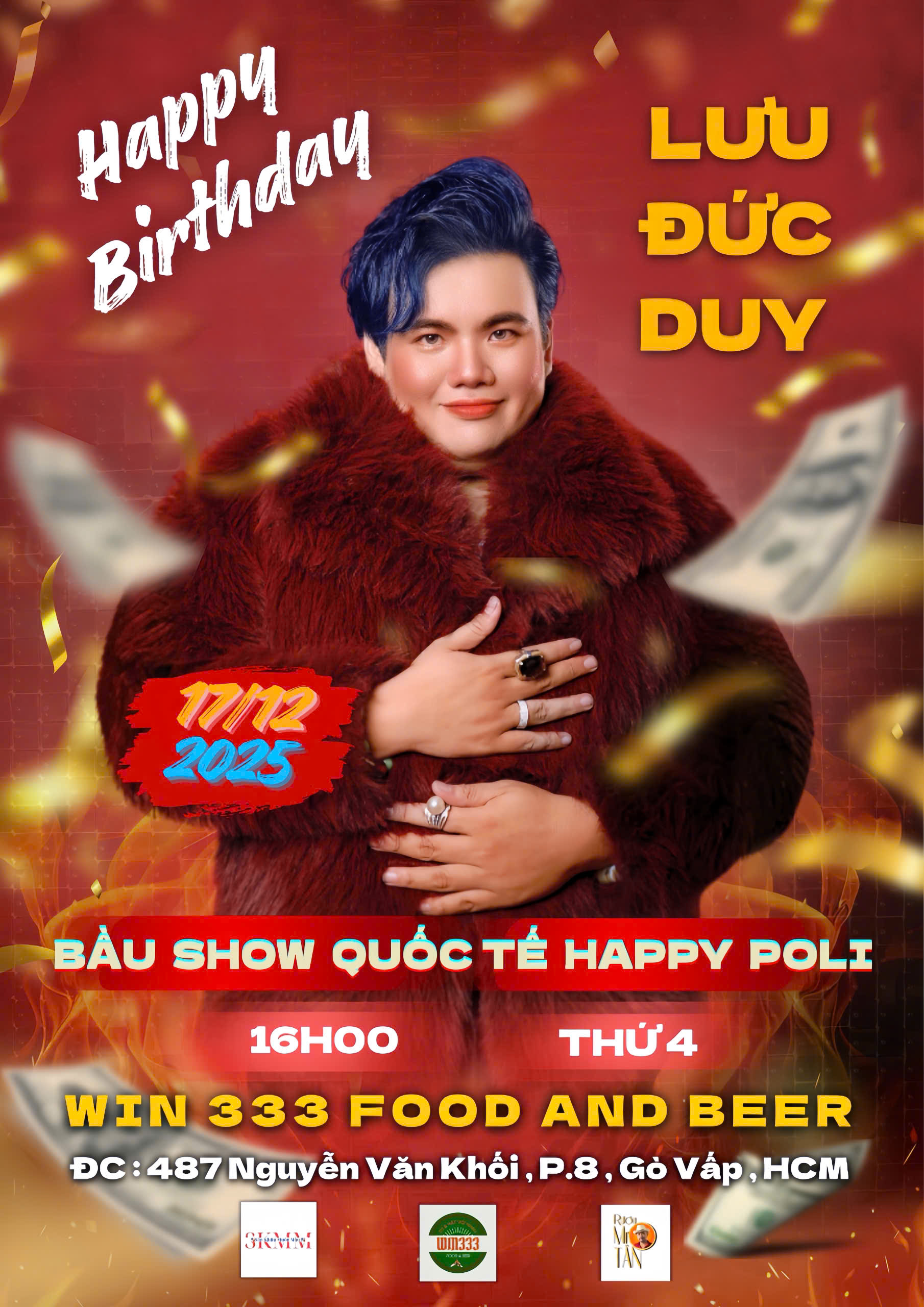 Sắp tới đây, (Ngày 17/12/2025) bầu sô quốc tế Lưu Đức Duy– người được giới nghệ sĩ trìu mến gọi bằng biệt danh Happy Polly– sẽ tổ chức bữa tiệc sinh nhật đặc biệt mừng tuổi mới. Không chỉ là một buổi tiệc mang dấu ấn cá nhân, sự kiện còn quy tụ đông đảo nghệ sĩ, người mẫu, hoa hậu và nam vương, hứa hẹn trở thành một trong những buổi gặp gỡ đáng chú ý của giới giải trí dịp cuối năm.