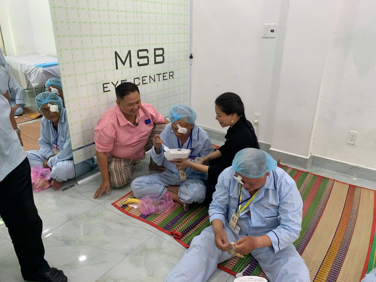Hoa hậu Dạ Minh Châu cùng nghệ sĩ Minh Béo chăm lo cho bệnh nhận mổ mắt trong chương trình.