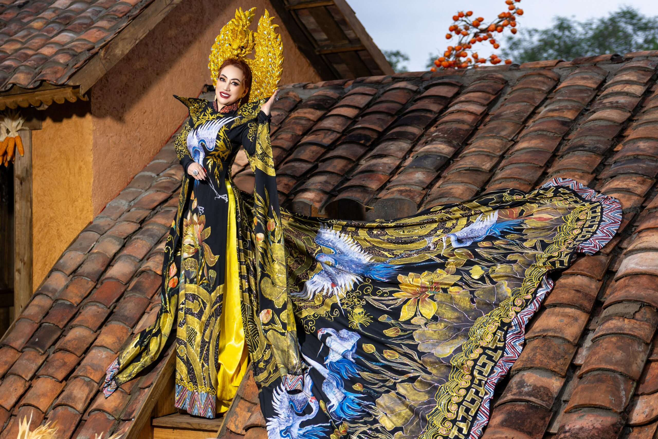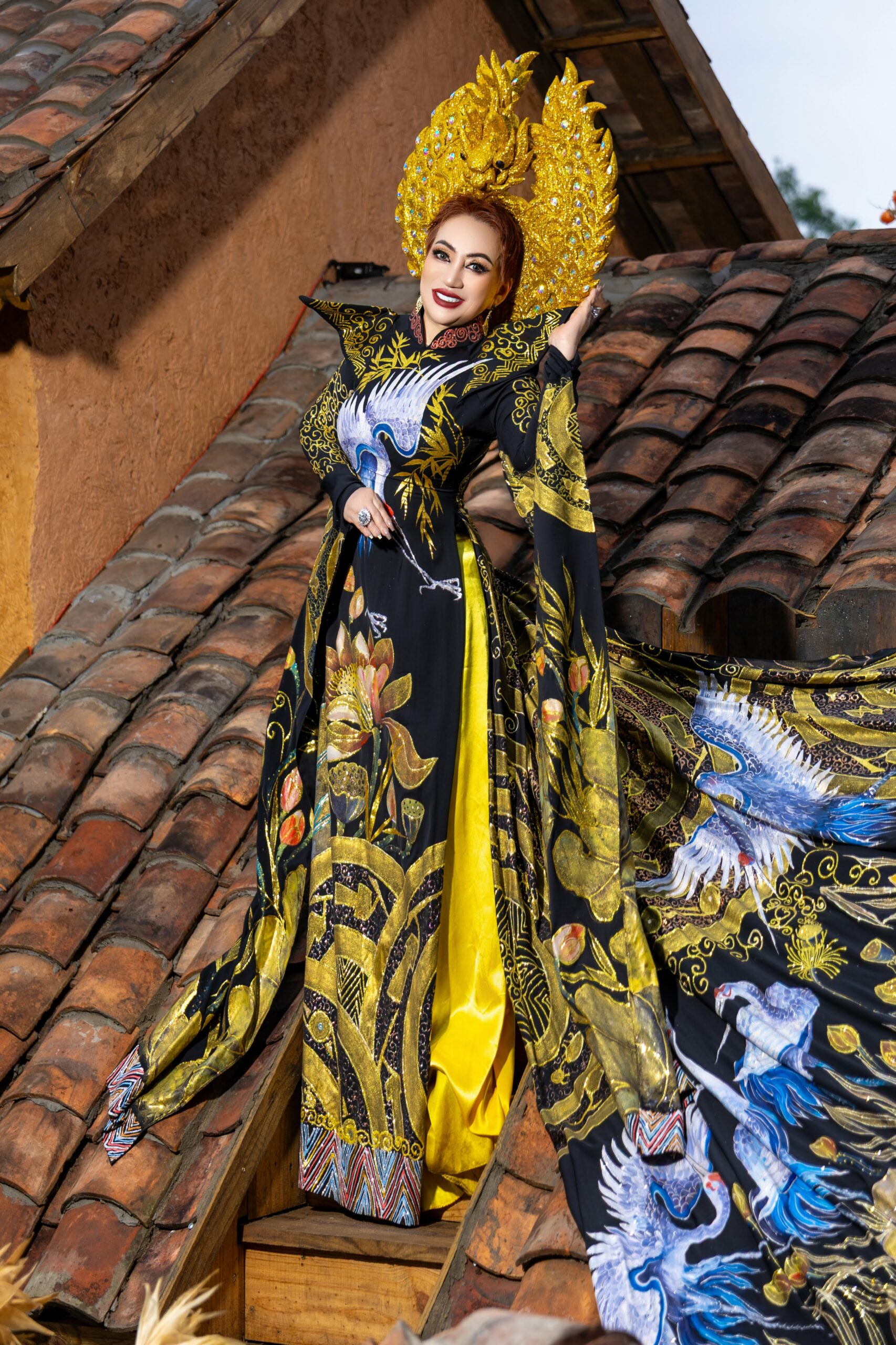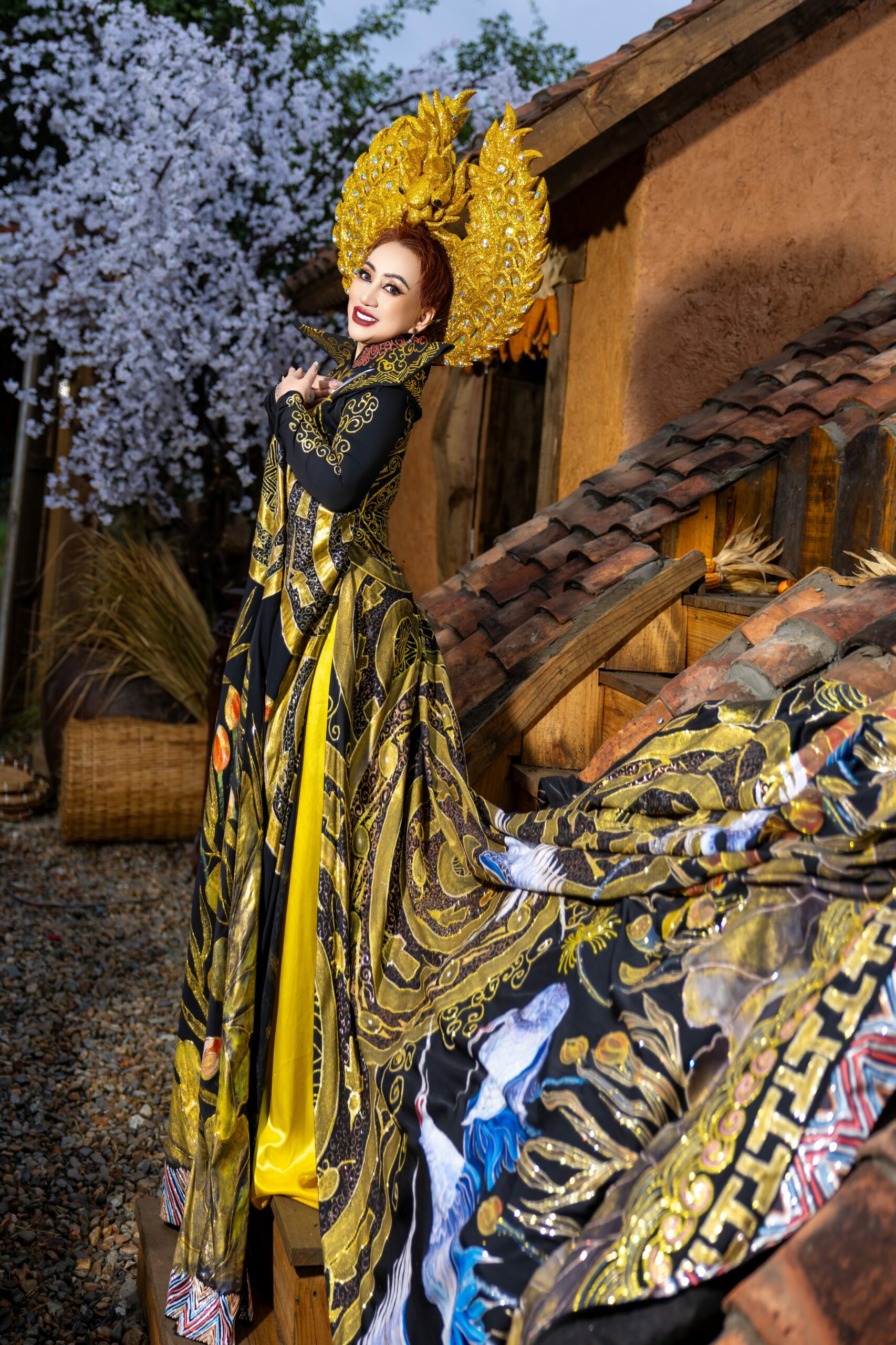 Bộ sưu tập áo dài mà Ly Ly Nguyễn thể hiện mang nhiều sắc thái và cung bậc cảm xúc khác nhau. Nếu thiết kế áo dài đen – trắng gợi lên vẻ đẹp huyền bí, sang trọng và kiêu sa, thì bộ áo dài sắc đỏ kết hợp cùng họa tiết mai vàng rực rỡ lại tượng trưng cho sự thịnh vượng, may mắn và thành công trong năm mới. Đặc biệt, thiết kế áo dài với tà rộng, nền vải trang nhã điểm xuyết hoa văn vàng óng ánh, kết hợp cùng phụ kiện đội đầu mang hơi hướng vương quyền đã giúp Hoa hậu Ly Ly Nguyễn toát lên thần thái của một nữ hoàng thực thụ – quyền lực nhưng vẫn dịu dàng, quyến rũ.