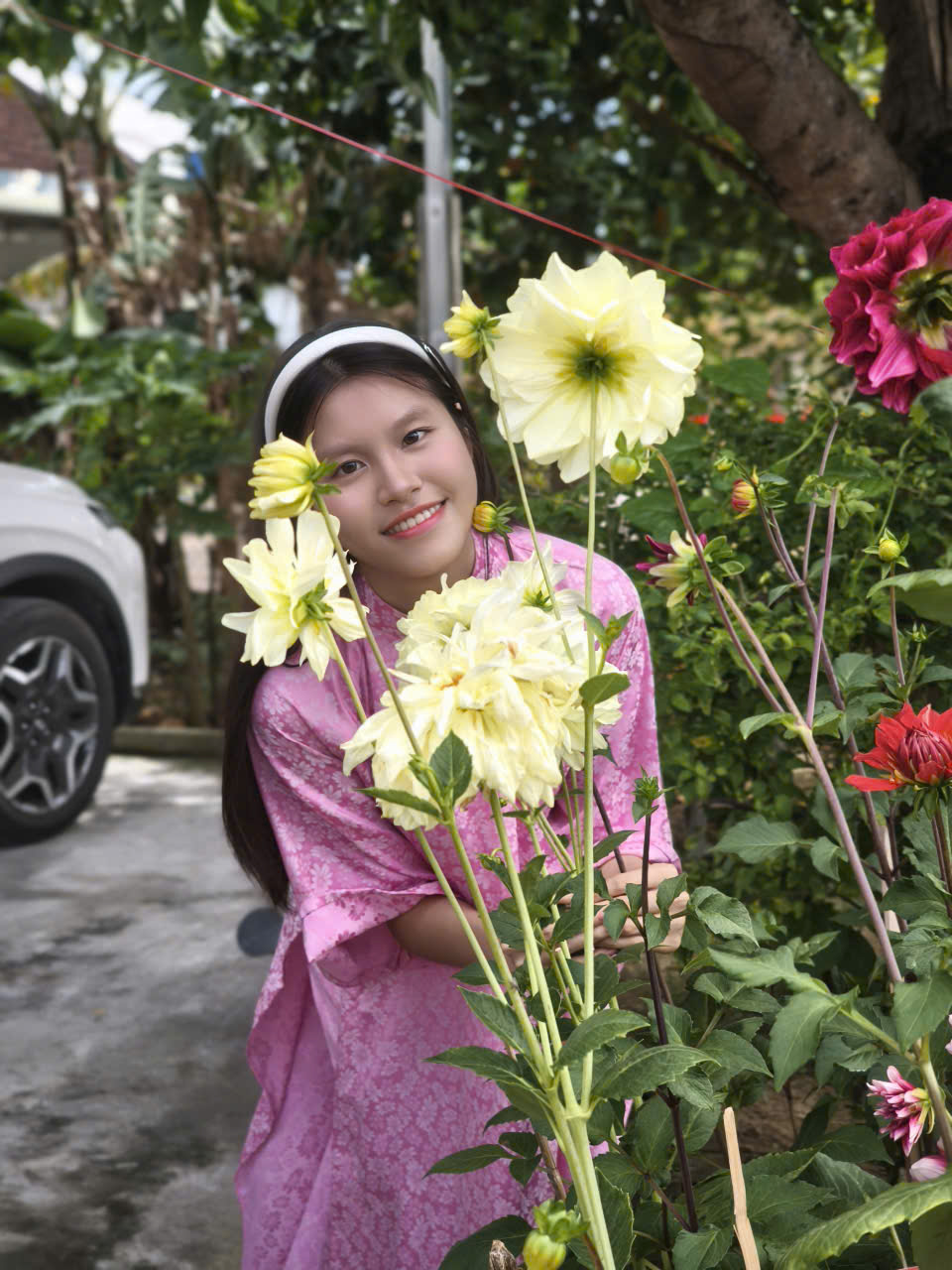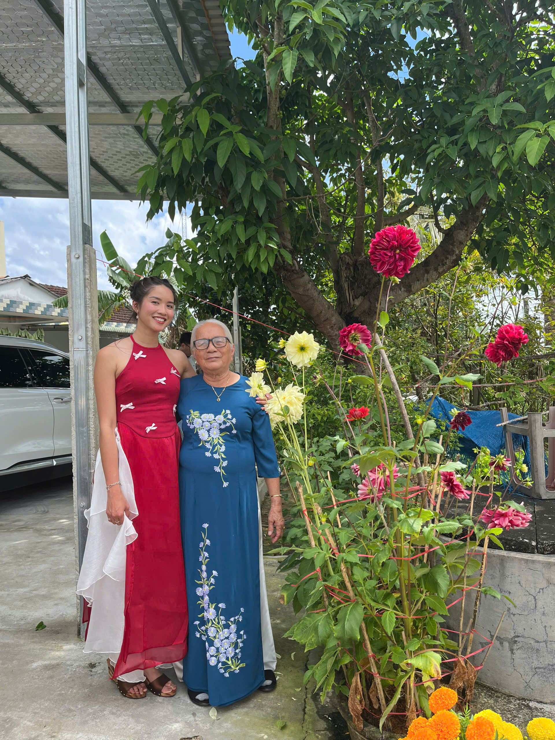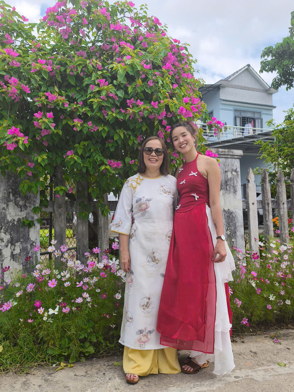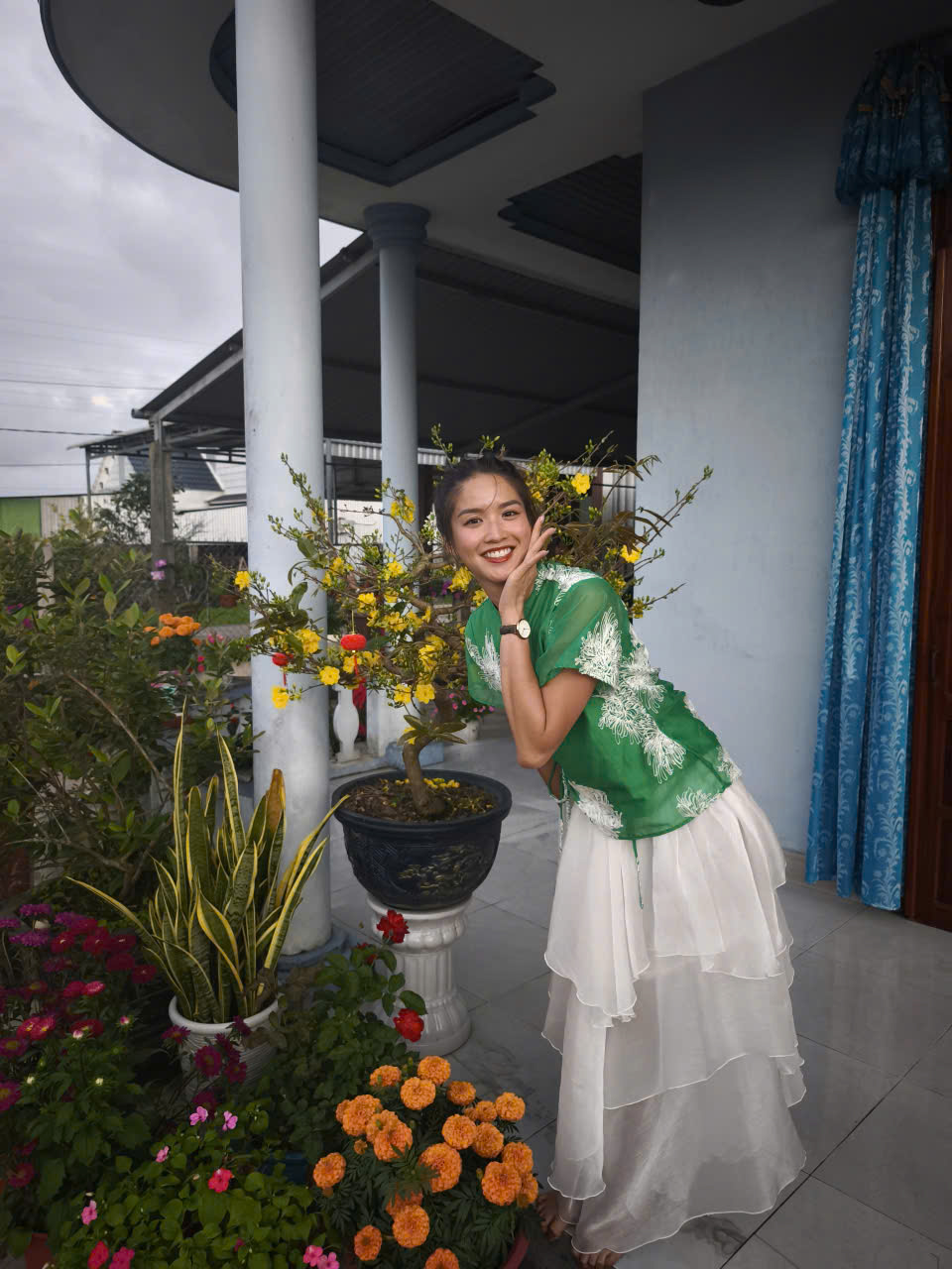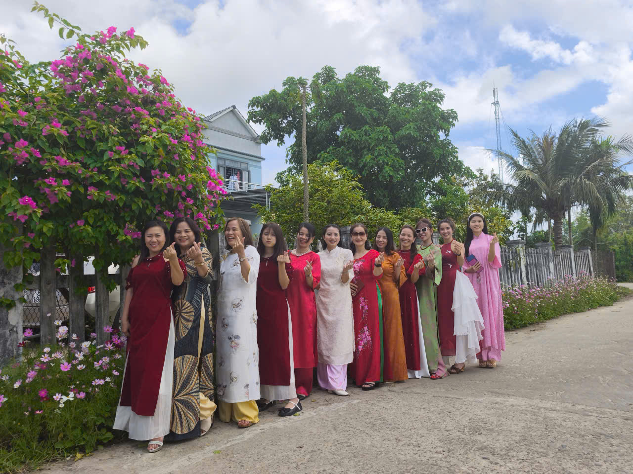 Giữa những con đường làng quen thuộc, rợp sắc hoa ngày Tết, hình ảnh các chị, các mẹ, các em duyên dáng trong tà áo dài truyền thống đã tạo nên một khung cảnh vừa mộc mạc, vừa rực rỡ. Không cần sân khấu lộng lẫy, chính nền trời xanh, những mái nhà yên bình và nhịp sống chậm rãi của miền quê lúa non trù phú đã trở thành phông nền hoàn hảo cho bộ ảnh đầu xuân.