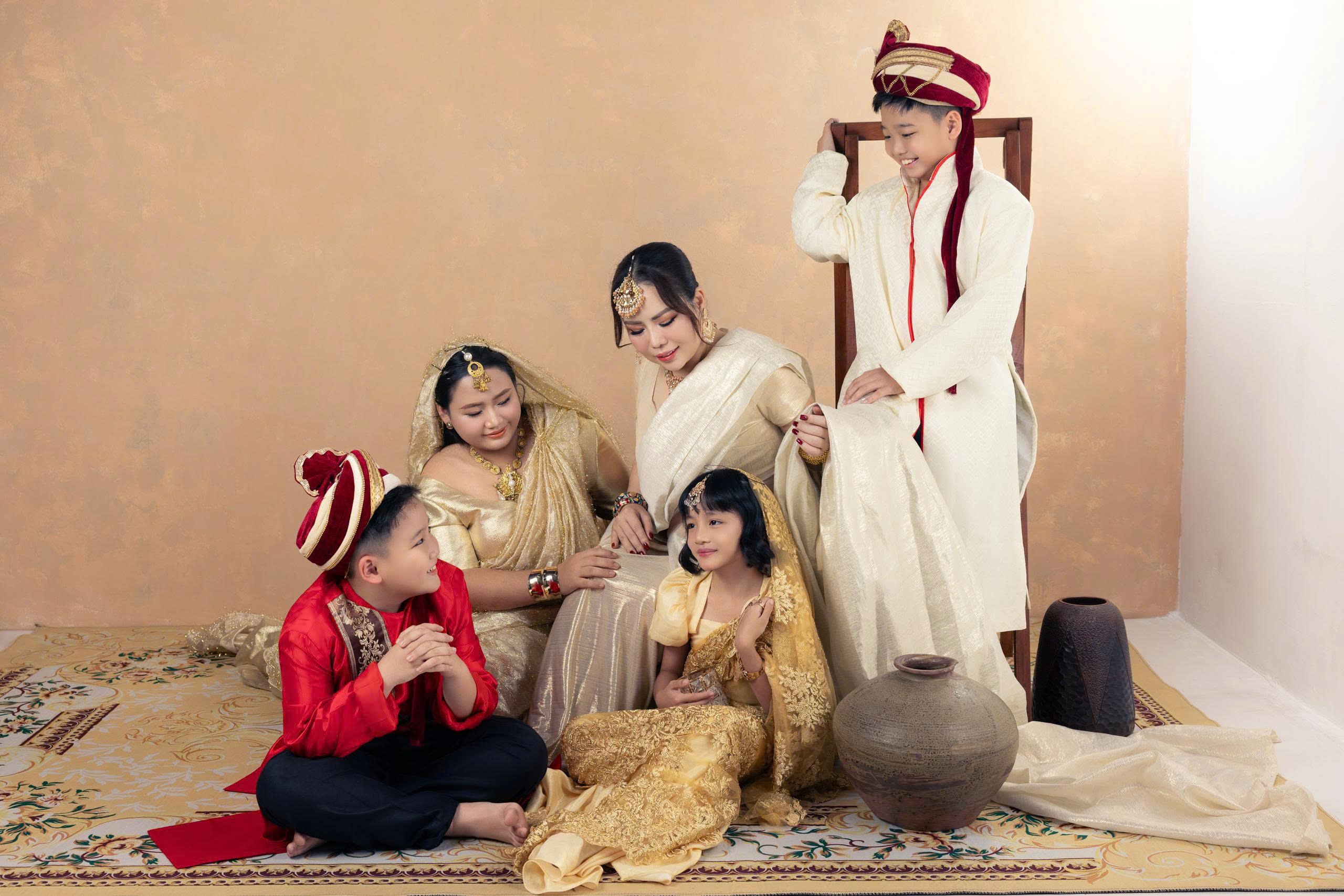 Lựa chọn ý tưởng độc đáo, nàng hậu cùng bốn con khoác lên mình trang phục truyền thống Ấn Độ. Các thành viên nữ duyên dáng trong những bộ sari mềm mại, tôn lên nét thanh lịch và nền nã. Trong khi đó, các bé trai diện trang phục Dhoti kết hợp Kurta cùng khăn Gandhi và Agri, tạo nên tổng thể hài hòa, ấn tượng. Sự kết hợp giữa tinh thần truyền thống Á Đông và sắc màu văn hóa Ấn Độ đã mang đến một bộ ảnh thời trang khác biệt nhưng đầy cuốn hút.